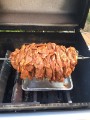 Für den Spieß: 4-5 kg Iberico Schweine-Nacken 2 große Zwiebeln Für die Marinade: 2 Tl. Thymian getrocknet oder frisch 4 Tl. Oregano geturocknet oder frisch 4 Tl. Sumach 6 Tl. Paprika edelsüß 4 Tl. Kreuzkümmel gemahlen 2-4 El. Sonnenblumenöl 1.000 gr. Türk. Joghurt Süzme 3 Tl. Meersalz 2 große Zwiebeln | | Die Marinade: Die Zwiebeln klein schneiden und in der Küchenmaschine pürieren. Den Joghurt unterrühren. Anschließend mit den restlichen Zutaten zu einer glatten Marinade verrühren. Das Öl unterrühren. Das Fleisch am Vortag in dünne (je dünner desto besser) Scheiben schneiden. Die Scheiben mit der Marinade sehr gut und gleichmäßig bestreichen und in einer Schale mind. 12 h (besser 20h) kalt stellen. Auf den Spieß zuerst eine große geschälte Zwiebel aufstecken, anschließend die Fleischscheiben eng und kompakt nacheinander aufschieben, bis alles aufgebraucht ist. Zum Abschluss die zweite große geschälte Zwiebel als Abschluss verwenden. Den Spieß mit den Halterungen mittig fixieren. Herunterhängende Fleischenden mit der Schere abschneiden (diese würden ansonsten im Grill nach unten hängen und verbrennen). Den Grill auf ca. 200° indirekte Hitze vorheizen. Wenn es der Platz zulässt, eine Aluschale mit Wasser in den Grill stellen (dann bleibt der Grill sauber). Den Spieß einhängen und den Deckel schließen. nach 45-60 Minuten kann die erste Lage mit einem scharfen Messer heruntergeschnitten werden. Dazu reicht man Fladenbrot, Rotkohl, Joghurtsauce, 'bisschen scharf', Zwiebeln, Eisbergsalat,....... |